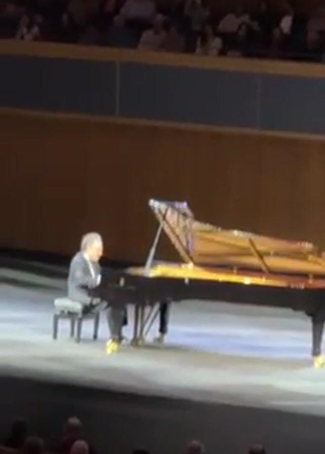man in a suit sitting at a grand piano on a stage, performing for an audience. The piano is black, with the lid open to reveal a gold interior. The man is facing away from the camera and towards the piano keys. The audience is seated in rows of seats that extend up to a higher balcony. The stage is lit, and the overall tone of the video is formal and cultural. The interior walls of the building appear to be wood panels.