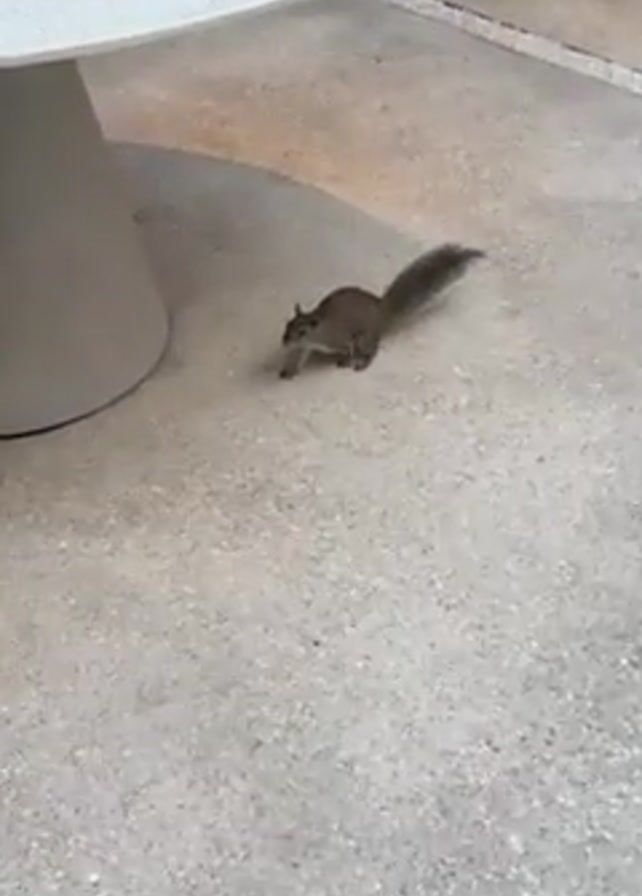 grey squirrel walking towards the camera on a speckled floor in an outdoor seating area