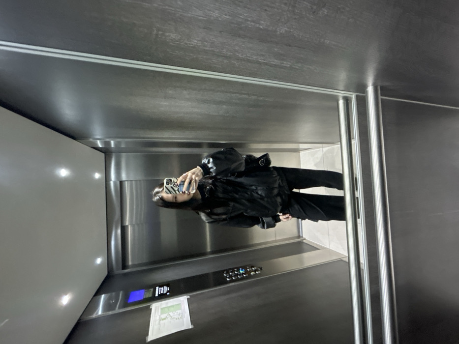 An elevator interior features stainless steel walls and a woman taking a selfie. She wears a black jacket, pants, and has a backpack. The elevator control panel is visible below. Papers lie on the floor. The space is modern, with clean lines and a neutral color palette, predominantly grays and blacks. Natural light is reflecting off the interior walls.