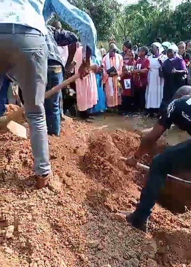 what appears to be a funeral service. A group of people, many dressed in white and pink robes, stand around a freshly dug grave. Two men use shovels to fill the grave with dirt. The ground is red clay. The setting is outdoors, with trees visible in the background.