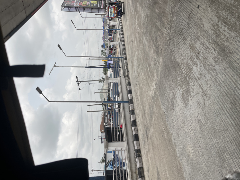 The image depicts an urban street scene in Yenegoa, Nigeria, captured on an overcast day from within a vehicle. The immediate foreground shows a light gray concrete road surface with parallel textural striations. A low concrete curb, painted with alternating black and white stripes, separates this foreground pavement from a pedestrian barrier. The midground features a pedestrian barrier constructed from white concrete pillars and horizontal metal railings, which have blue accents. Behind this barrier, another paved surface is visible, hosting several vehicles, including a white sedan and other indistinct cars. A person wearing a red top is partially visible, positioned low to the ground near the white sedan. Numerous tall streetlights, some equipped with solar panels, are spaced along this area. Overhead power lines crisscross the upper midground, supported by utility poles. To the far right, a three-wheeled motorized auto-rickshaw, colored red, blue, and yellow, is partially visible and appears to be in motion, heading towards the right. A large vertical billboard displaying commercial advertisements, including text "REAL LIVING" and "DELIVERANCE," stands behind the auto-rickshaw. On the left, a large blue and white billboard or mural is situated behind the barrier. The background consists of various low-rise buildings, some with corrugated metal roofs, suggesting a mix of commercial and residential structures. The sky is uniformly covered with gray clouds, indicating an overcast condition without direct sunlight. Minimal vegetation is present. No direct interactions between individuals are discernible, and the primary visible action is the movement of the auto-rickshaw.