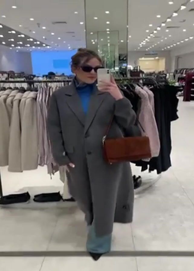 A woman with her hair in a bun stands in a store, taking a selfie in a full-length mirror. She is wearing a long grey coat, a blue turtleneck sweater, light-colored wide-leg pants, and black shoes. She has sunglasses on. A brown purse hangs off her shoulder. The store around her is brightly lit, with racks of clothes behind her.