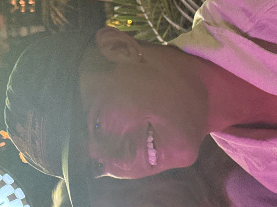 A young adult male is depicted in a medium close-up, viewed from the upper chest up, in an evening or nighttime setting in Uluwatu, Indonesia. He wears a dark green brimmed hat featuring a patterned band, a light-colored collared shirt, and a small hoop earring in his visible left ear. His face is illuminated by a magenta-pink ambient light, causing reflections in his eyes, and he is smiling, revealing his teeth. He is looking slightly to the viewer's right. The background is blurred, showing indistinct green foliage, likely palm fronds, and various out-of-focus lights, including distinct yellow-orange circular lights and a partial white and black checkered pattern in the upper left, consistent with a social establishment or bar environment.