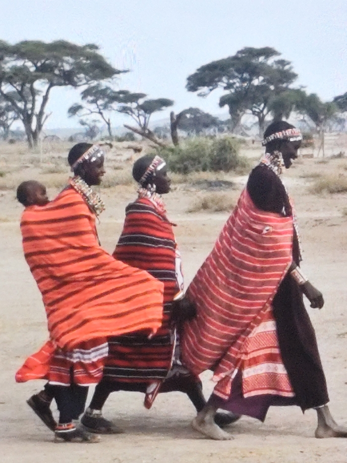 Four individuals, consisting of three adult females and one infant, are depicted walking from left to right across a dry, light-colored earthen path. This scene is situated in a rural or semi-rural area within Dodoma, Tanzania, characterized by scattered acacia trees and sparse ground vegetation under a pale sky in the background. The leading adult female, on the far left, carries an infant on her back, secured by a large, horizontally striped fabric in shades of red and orange. She wears dark clothing underneath this wrap, along with elaborate beaded headwear, necklaces, and dark closed-toe shoes. The second adult female walks directly behind her, dressed in a dark garment covered by a vertically striped fabric in red and black. She also wears beaded headwear and necklaces, and dark closed-toe shoes. The third adult female, positioned on the far right, is clothed in a dark top and skirt, with a diagonally striped red and white fabric draped over her left shoulder and extending down. She also wears beaded headwear and necklaces, and appears to be walking barefoot. All individuals are in a walking stride.