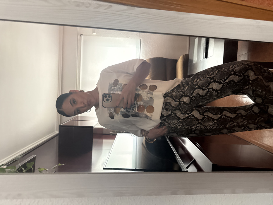 A female subject is captured in a full-length mirror selfie within an indoor residential setting in Burjassot, Spain. The subject is positioned centrally, facing the mirror, with her head slightly tilted and lips pursed. She has dark hair pulled back and is wearing large hoop earrings, multiple bracelets on her right wrist, and a ring on her left ring finger. Her attire includes a loose-fitting, light-colored t-shirt with a graphic design of various circular shapes, and wide-leg pants featuring a grey and black snakeskin pattern. She holds a light-colored smartphone, likely an iPhone with a triple camera array, in her left hand, using it to capture the image. Her right hand is tucked into the waistband of her pants. The reflected background reveals a dark-toned media console supporting a flat-screen television, a dark brown armchair, a light-colored window blind, and a plant situated on an elevated shelf to the upper left.