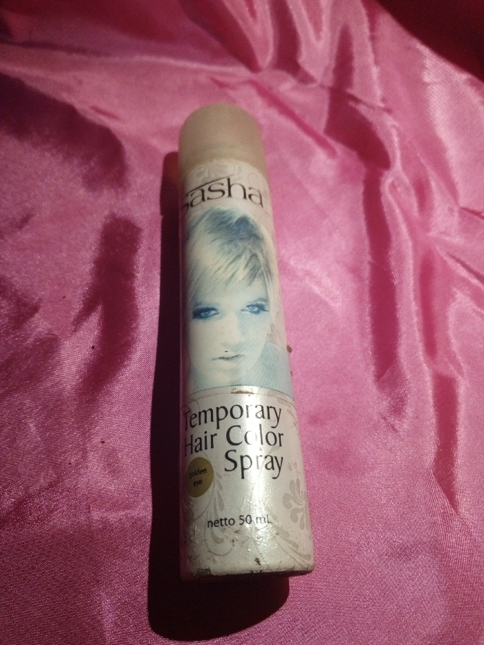 The image features a can of Sasha temporary hair color spray. The can is white and has a picture of a woman with short blonde hair on the front. The label reads "Temporary Hair Color Spray" and "golden eye". The cap is opaque and slightly yellowed. The can appears to be slightly worn. The background is a pink fabric with visible wrinkles and texture.