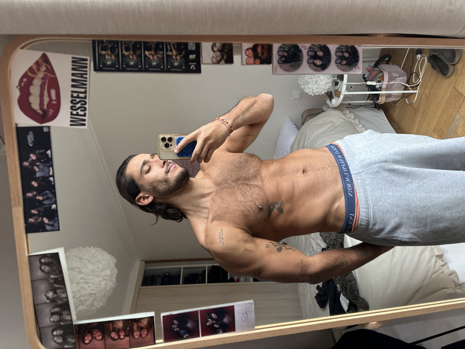 The image captures a shirtless adult male taking a mirror selfie within a residential interior in Paris, France