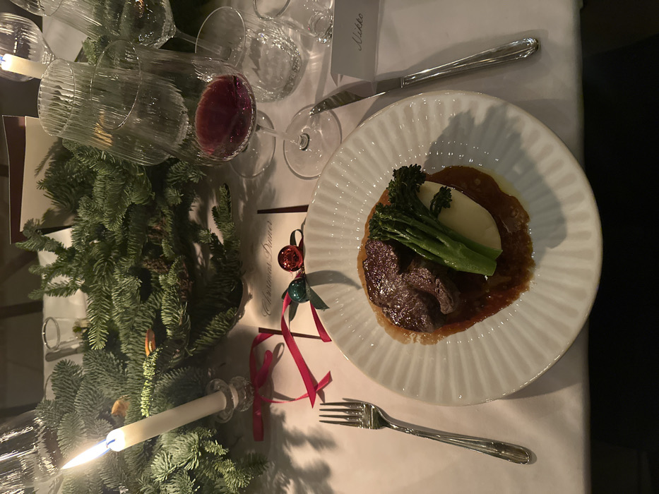 A dinner table is set with a plate of meat, mashed potatoes, and broccoli in gravy. A name card sits beside the plate. A red wine glass and several empty glasses are present. A small Christmas tree with a lit candle and ornaments decorates the table. The lighting is dim.