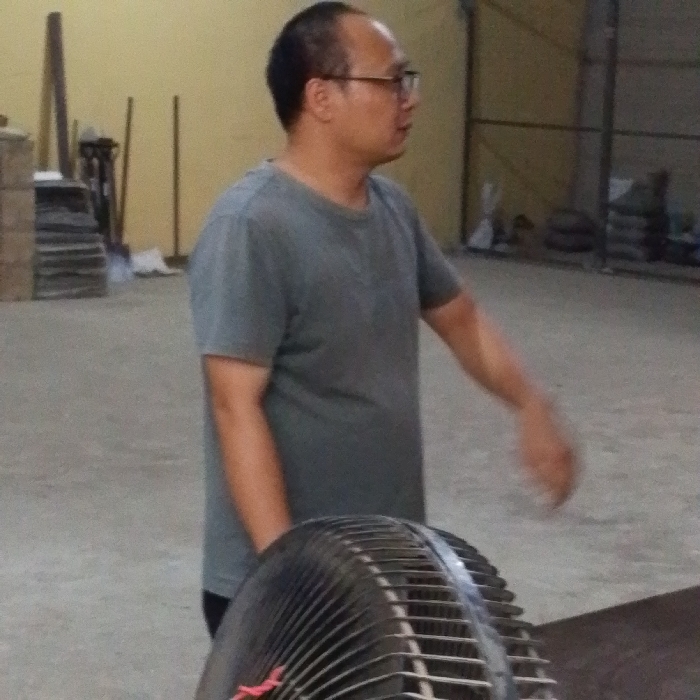 An Asian man wearing glasses and a gray t-shirt stands in what appears to be a warehouse or large room. He is looking to his right, and his right arm is extended. A fan is partially visible in the foreground. The background contains stacks of materials and equipment. The lighting is bright but somewhat uneven.