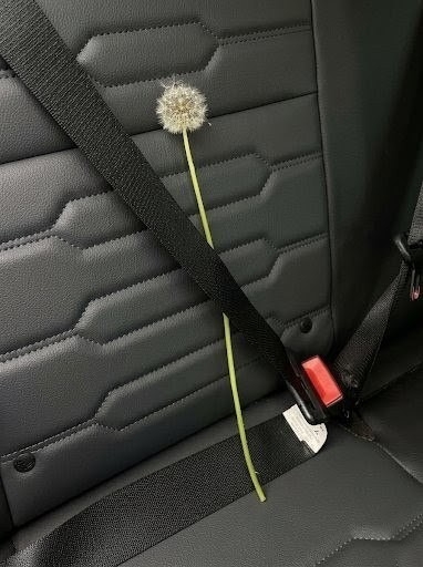 The scene shows a dandelion placed on the black leather back seat of a vehicle