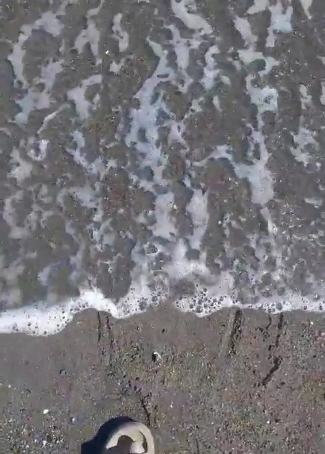 The video depicts a person standing on a dark sandy beach as waves from the ocean wash onto the shore. The camera angle is from a first-person perspective, showing the person's feet wearing light-colored sandals. The waves are foamy and gray as they meet the sand, receding back into the ocean. Footprints are visible in the dark sand.