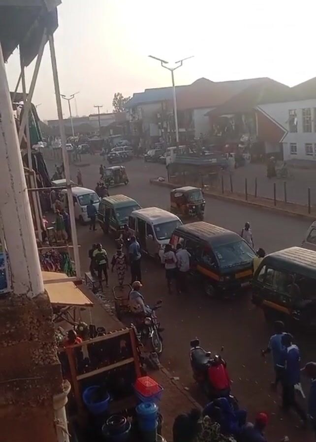 street scene in what appears to be an urban area. There are numerous vehicles, including vans, cars, and auto rickshaws, lined up along the road, creating a busy scene. People are walking on the sidewalks and between vehicles, interacting with each other. The scene is captured from an elevated perspective, possibly from a building overlooking the street. In the foreground, there's a display of various items, including buckets, containers, and what looks like household goods, indicating a marketplace or a shop. The overall environment seems bustling with activity, characteristic of a busy market day. The sky is bright, suggesting daytime. The architecture visible includes buildings with corrugated roofs and painted facades.