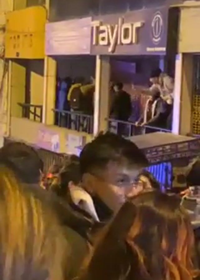 crowd of people outside a building with a sign that says "Taylor". Some people are on a balcony above the crowd, waving flags and gesturing to the people below. The lighting is dim and appears to be night. There are security fences set up in front of the building. Some people in the crowd are holding up their phones.