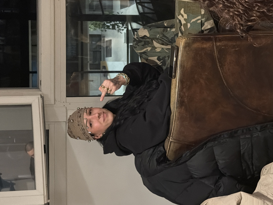 An adult female is depicted seated in a brown, worn leather-like armchair, positioned slightly to the right of the frame. She has long dark hair and is wearing a tan crocheted beanie adorned with numerous silver-toned studs and small safety pin-like embellishments, a black hoodie, and camouflage-patterned trousers. Her right hand is raised towards the viewer, with the middle finger extended in a gesture commonly perceived as offensive. She wears multiple gold-toned rings, including a prominent one on her right index finger, and a wide gold-toned bracelet on her right wrist. A dark tattoo pattern is visible on the back of her right hand and wrist. Facial markings include a red dot on her forehead and a series of three red dots below her right eye. A black puffer jacket is draped over the left side of the armchair. A smartphone with a dark case rests horizontally on the right armrest. The background consists of white-framed windows, revealing a dark exterior, suggesting nighttime. A reflection of a person's head is visible in the upper left window pane. The indoor setting appears to be a casual lounge or common area within the city of Saint-Denis, France. A partial view of curly brown hair is present in the bottom right corner of the frame, indicating the presence of another individual.