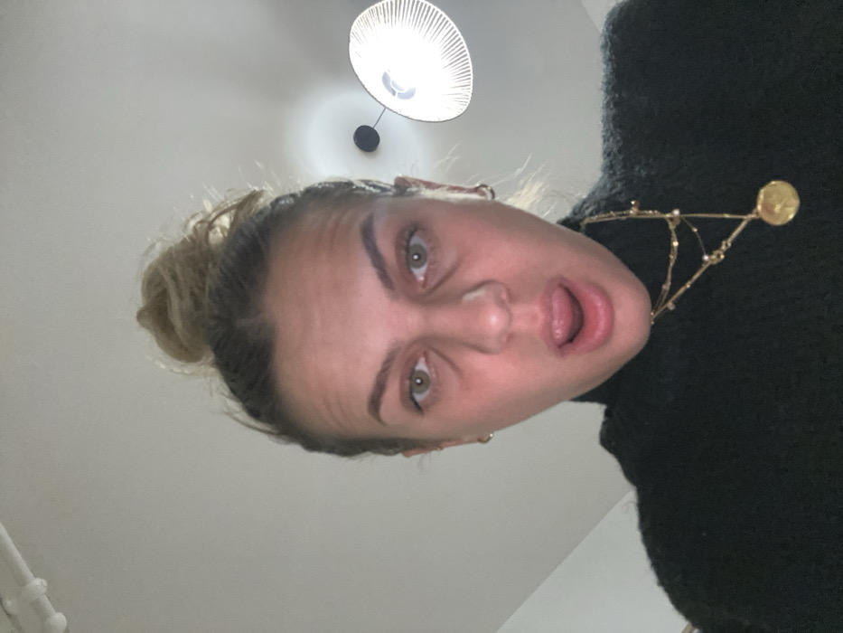 A woman's face fills the frame, tilted upwards towards the camera. Her expression is exaggerated, with her mouth open and tongue slightly protruding. She has light skin, green eyes, and her hair is pulled back in a messy bun. She is wearing a dark turtleneck sweater and a gold geometric necklace with a coin pendant. Above her head is a ceiling light fixture with a white lampshade. The background is a blurry, neutral-colored wall.