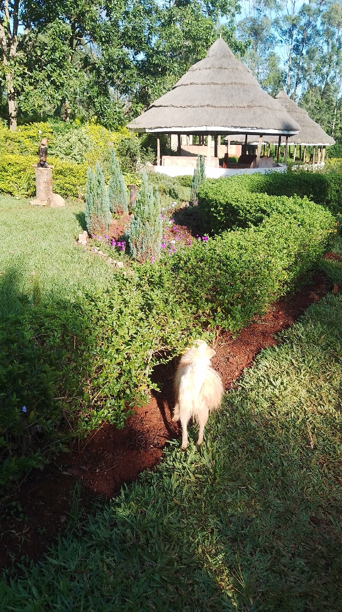The image displays a landscaped garden in Kisa Central ward, Kenya, illuminated by direct sunlight. In the foreground, a light-colored, long-haired dog, viewed from behind, stands on a reddish-brown dirt path, its head directed towards green bushes bordering the path on the left. The path winds through meticulously maintained green bushes and shrubs, with patches of green lawn grass visible. Smaller coniferous-type shrubs and scattered purple and white flowering plants are interspersed among the greenery. In the midground, two circular structures with prominent conical thatched roofs are visible. The foreground structure features open sides supported by wooden columns, revealing internal reddish-brown low walls or benches. A second, smaller thatched structure is partially visible behind it. To the left of the thatched structures, a dark, bird-like sculpture is mounted on a light-colored, cylindrical stone pedestal. The background consists of dense, tall green trees against a clear blue sky.