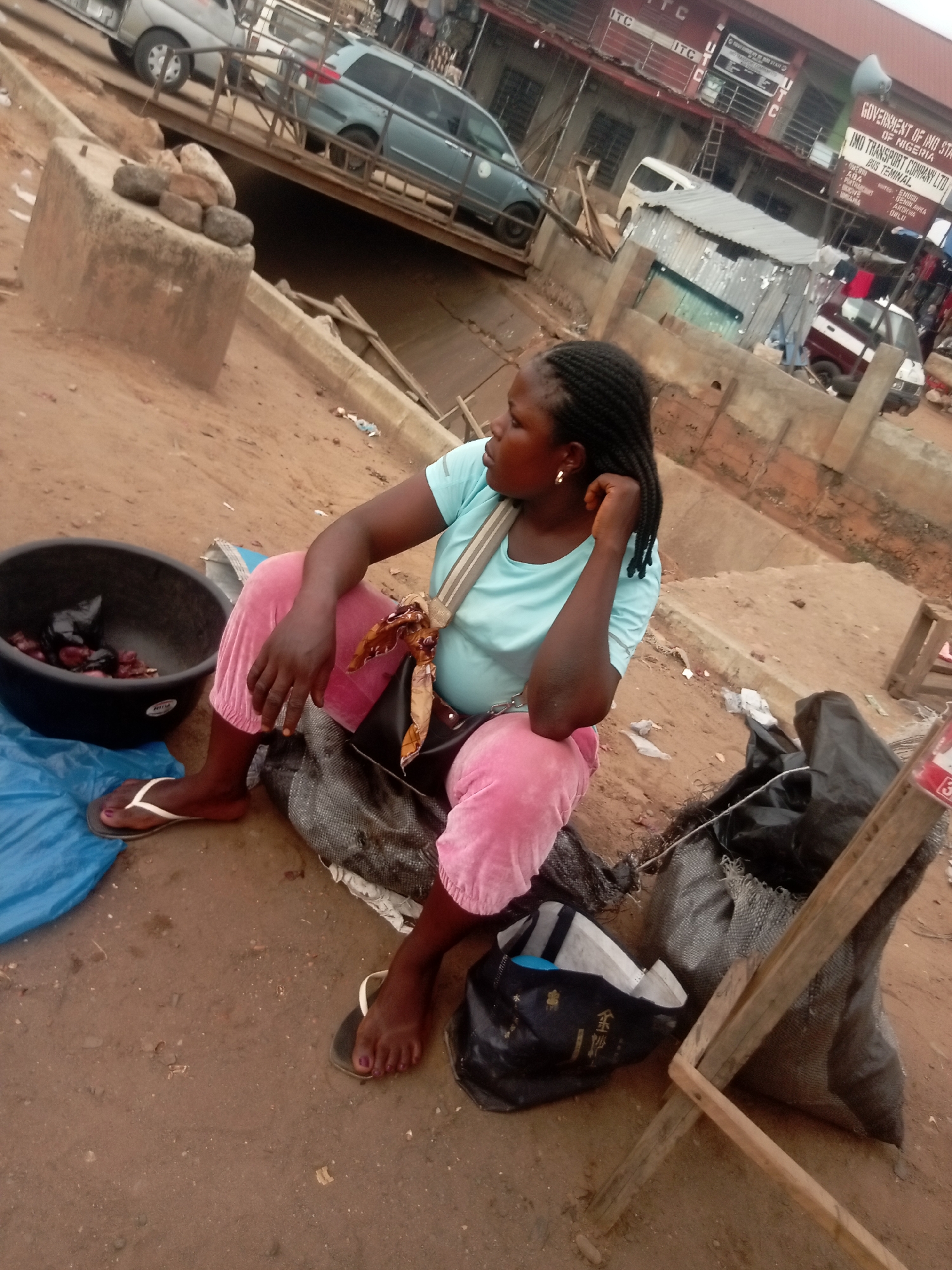 The image depicts a woman sitting on the ground in what appears to be a market area. She is wearing a light blue shirt and pink pants, with flip-flops on her feet. She has her hand to her face and appears to be looking off into the distance. Next to her is a black basin containing a dark substance, possibly food, and a blue tarp. There are also several bags and a wooden structure nearby. The background shows a busy street scene, with cars passing under a bridge. Buildings are visible, including one with a sign that reads "GOVERNMENT OF IMO STATE OF NIGERIA, IMO TRANSPORT COMPANY LTD., BUS TERMINAL," suggesting the city of Onitsha, Nigeria, is the location. The ground is bare and dusty.