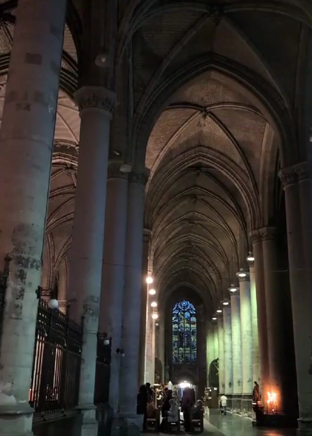 interior of a cathedral. Tall, grey stone columns line the nave, leading the eye towards a large stained-glass window at the far end. Arched ceilings create a sense of height and grandeur. Several small groups of people are gathered near the center of the frame, some seated. A small, flickering flame is visible on the right side of the nave. The lighting is dim, with hanging lights illuminating the walkway. The overall atmosphere is solemn and quiet, with the echoing sound of organ music.