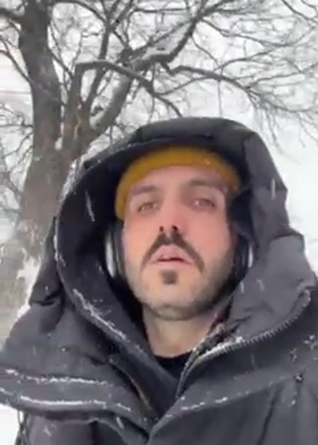 A man wearing a black hooded jacket and a yellow beanie stands outside in a snowy environment. He has headphones on and is looking forward. Snowflakes are falling around him and visible on his clothing. A bare tree is visible behind him.