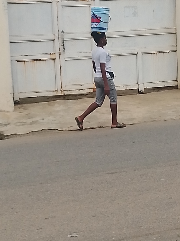 A young individual is captured walking from right to left on an asphalt road in Lokoja, Nigeria. The person, appearing to be female, wears a white short-sleeved t-shirt with a dark graphic on the back, grey knee-length shorts, and brown flip-flops. A black fanny pack is strapped around their waist, positioned on the right side. Balanced on the individual's head is a light blue plastic bucket, possibly a paint container, with a dark handle and a partially visible red and white circular logo on its side. The background features a light-colored concrete sidewalk immediately behind the subject, displaying cracks and dark stains, leading to a large, off-white, multi-paneled metal gate. The gate exhibits significant rust along its bottom edge and in vertical streaks, and a door latch mechanism is visible on its right panel. A segment of a light-colored wall or pillar is visible to the far left, adjacent to the gate. The scene is illuminated by natural daylight.