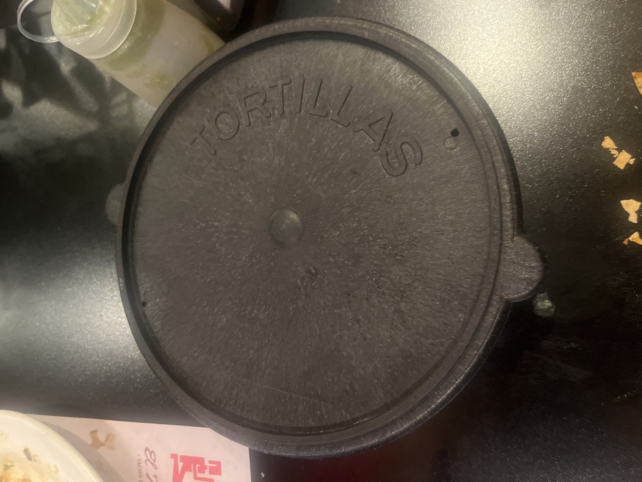 - "A black tortilla warmer lid with "TORTILLAS" embossed on the top sits on a black surface" by FM-2bnDB3, licensed under CC BY 4.0