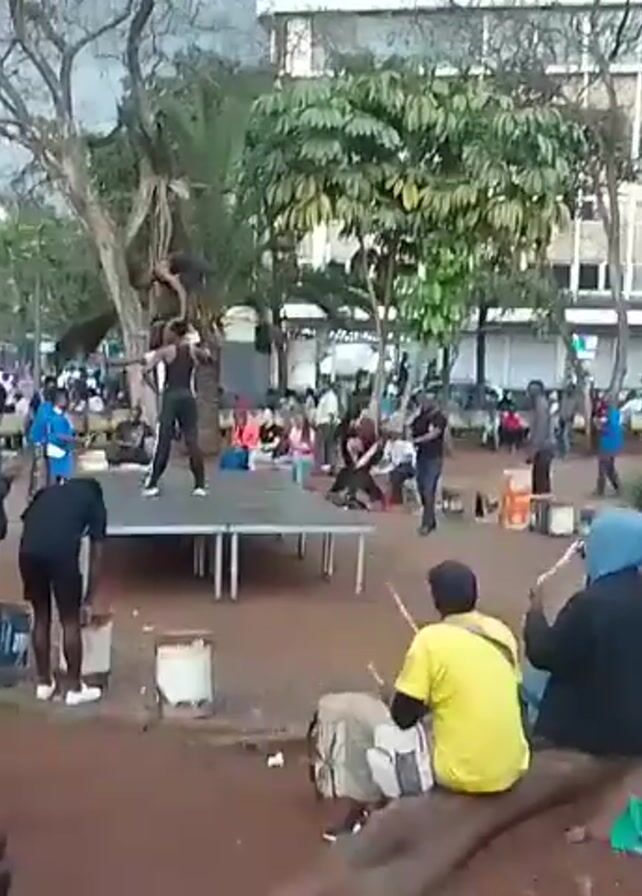 A group of people has gathered in a park, apparently watching a performance on a small, elevated platform. Two individuals are dancing on the platform. A small group is drumming along to the performance on the ground near the platform. Some people are sitting on the roots of a large tree in the foreground, possibly watching the performance. There are several other people sitting and standing around the area. There are buildings surrounding the park. There is a bus to the left of the frame. The park seems to be well-attended and full of activity.