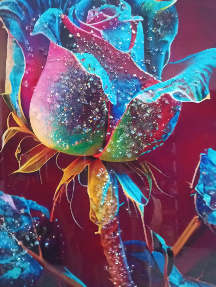 - "The image displays a close-up, vertical-format photograph of a highly stylized, multi-colored rose, likely an artificial decoration or artwork" by FM-KHTMm1, licensed under CC BY 4.0
