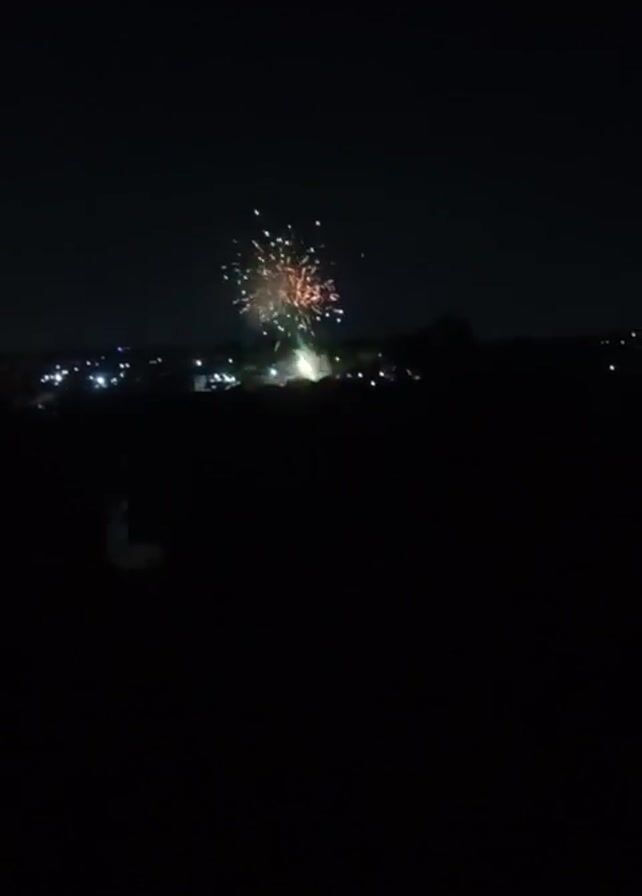 The video depicts a nighttime fireworks display. Several fireworks are visible exploding in the dark sky, illuminating the surroundings with flashes of red, white, and gold colors. Below the fireworks, in the distant background, there are faint lights suggesting a settlement or town. The foreground is obscured by darkness, hinting at an elevated perspective overlooking the area where the fireworks are being launched. There is a faint presence of a person in the foreground.