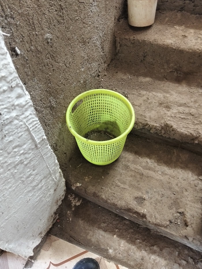 A bright yellow, plastic, mesh basket sits on a rough, concrete step. The step is part of a staircase leading upwards. A larger, pale bucket is visible on a higher step. The basket is partially filled with dark debris. A white, textured wall is to the left of the basket. In the lower left corner, tile flooring with geometric patterns is visible. A dark object, likely a shoe, is also present at the bottom.