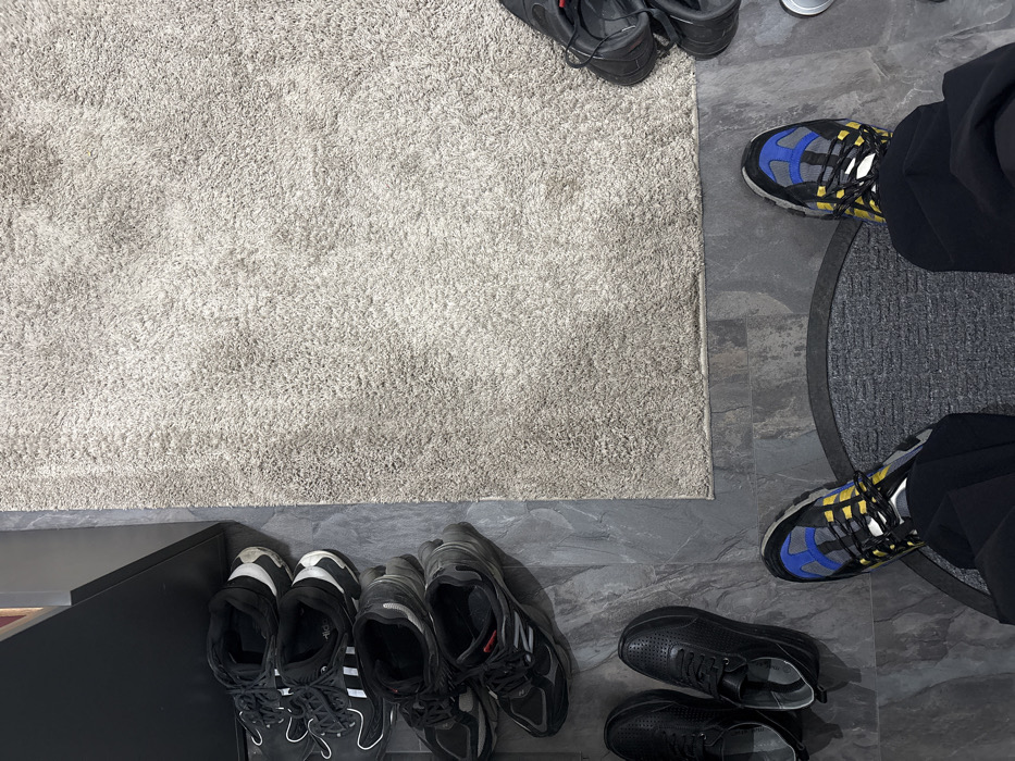 This image presents an overhead view of an indoor floor area in Pernik, Bulgaria. The lower legs of an individual are visible in the foreground, clad in dark trousers and wearing a pair of multi-colored athletic shoes featuring blue, yellow, and black components. The individual stands on a dark grey, semi-circular textured mat. The floor consists of dark grey, possibly slate or large-format tiles. Six pairs of shoes are present within the frame. The individual wears one pair. To the left of the individual, four additional pairs of shoes are arranged on the dark grey floor: two pairs of black casual or dress shoes, one pair of black and white striped athletic shoes (partially obscured by a black cabinet or furniture piece), and one pair of dark grey athletic shoes with a visible "N" logo. A sixth pair of dark athletic shoes is partially visible on the right edge of the frame. A large, rectangular light beige or off-white high-pile area rug occupies the central and right portions of the image, contrasting with the dark grey flooring.