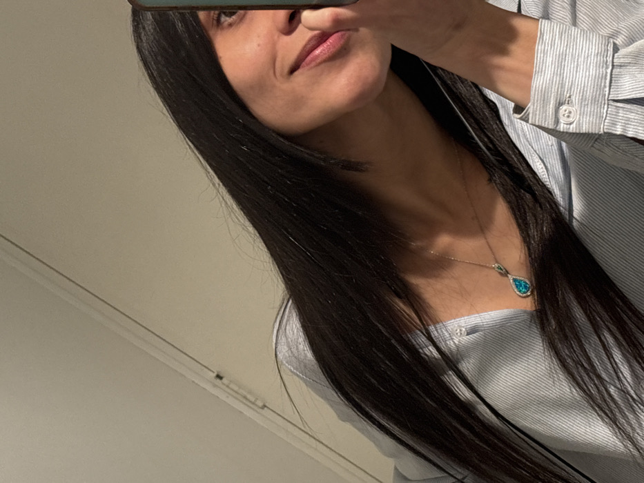 An indoor scene in Bogota, Colombia, depicts a female subject from the upper torso, captured at an upward angle. The subject, with long, straight, dark hair cascading over her shoulders and chest, is positioned with her right profile towards the viewer. Her face is partially obscured on the right side by a dark-colored smartphone held in her right hand; only her right eye, the right side of her nose, and her mouth are fully visible. Her lips are faintly parted in a slight smile. She wears a light blue, striped collared shirt with visible buttoned cuffs on her right arm. A silver-toned necklace, featuring a pear-shaped turquoise-colored pendant encircled by small clear stones, rests centrally on her chest. The background consists of a plain, light-colored wall, with a distinct white molding or trim visible along the upper left edge of the frame.