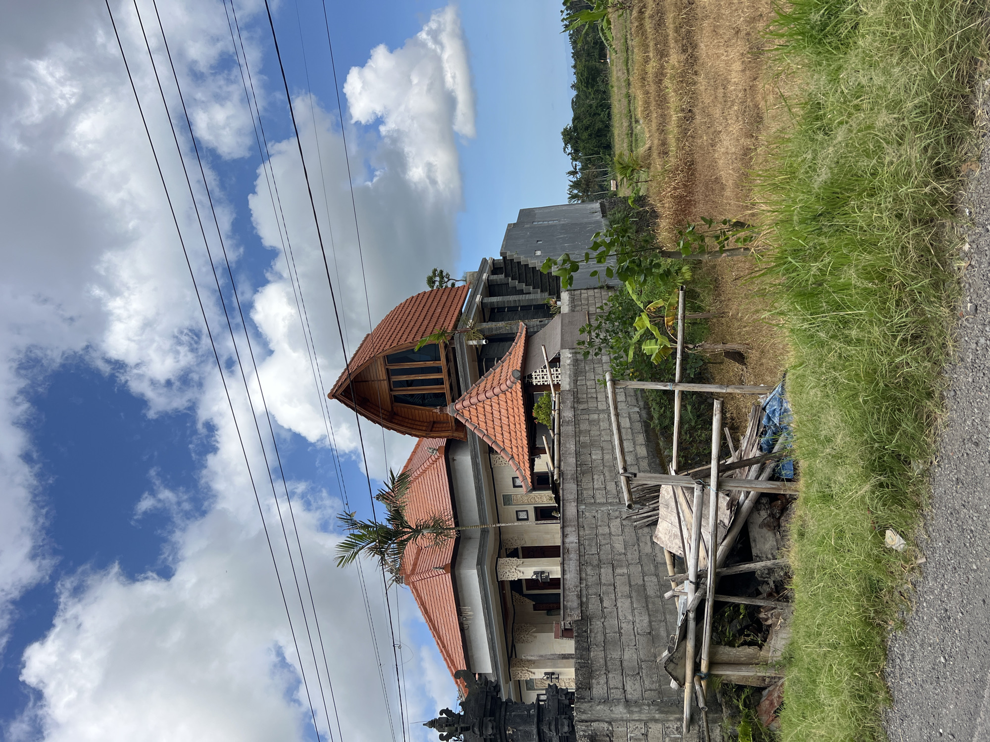 The image captures a scene in Bebandem, Indonesia, showcasing a traditional Balinese house with a distinctive red-tiled roof. The house has multiple levels, incorporating wooden architectural elements. A neighboring modern gray building with an external staircase stands adjacent. In the foreground, there's a concrete block wall and a pile of construction materials, including bamboo scaffolding and debris. Lush green grass grows along the roadside, transitioning to dry rice fields in the background. Overhead, power lines crisscross the sky, which is partly cloudy with patches of blue.