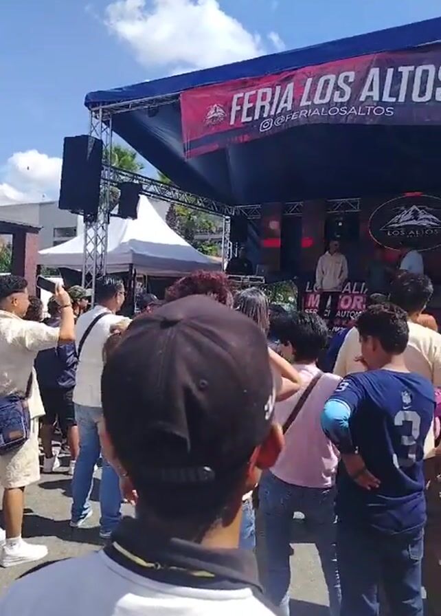 crowd of people watching a performance on a stage outdoors at a "Feria Los Altos" event. The stage has a banner with the event name and an Instagram handle. The people are casually dressed and appear to be enjoying the event. Several people are looking at the stage and one person takes a picture with his cell phone. The weather appears to be sunny and clear.