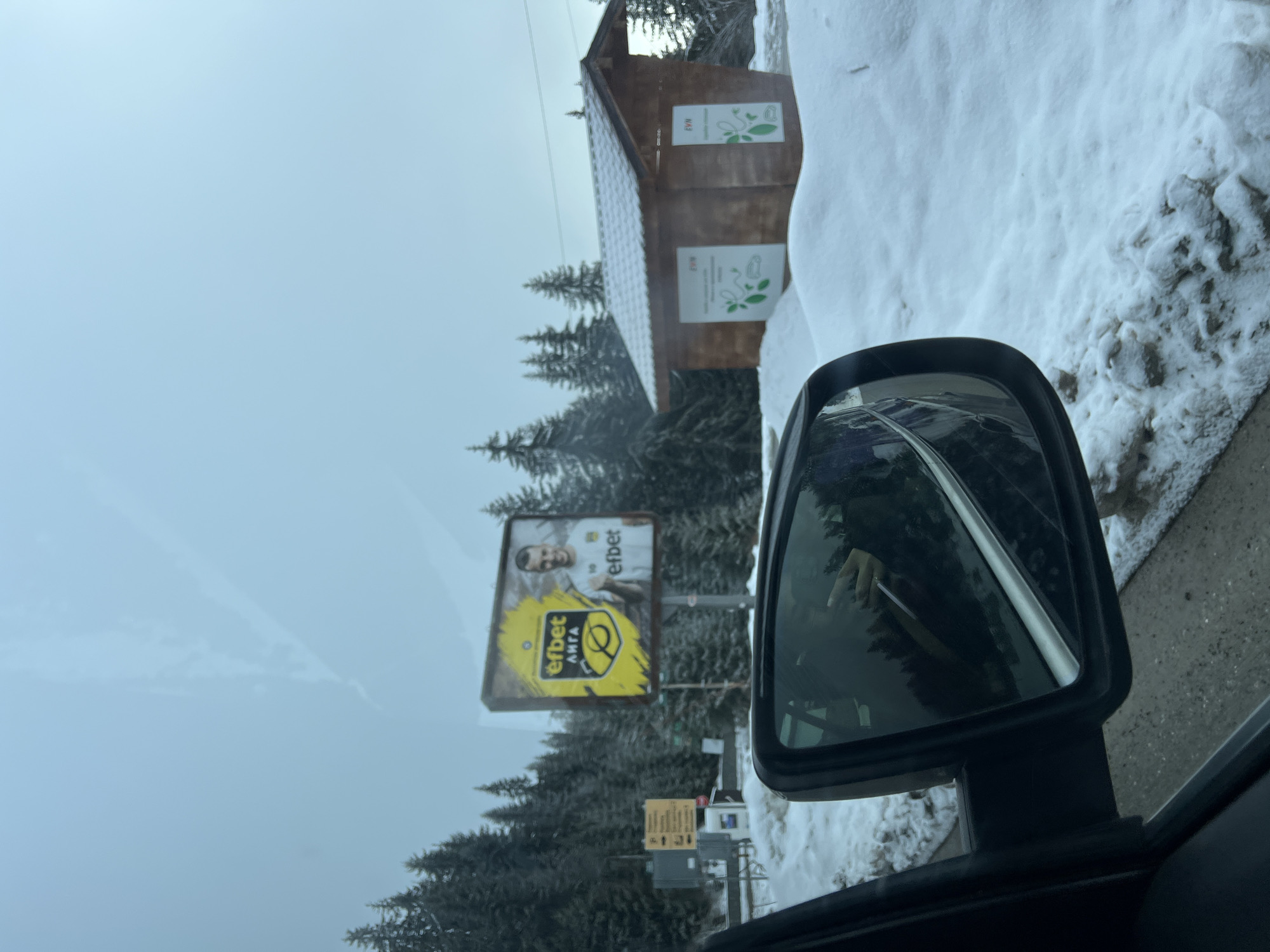 scene in Smolyan, Bulgaria, taken from inside a vehicle. A side mirror is visible in the foreground, reflecting the snowy environment. In the background, there are pine trees, a billboard advertising "efbet" with a soccer player, and a wooden structure with signage. Snow covers the ground. The sky is overcast, suggesting a winter day.
