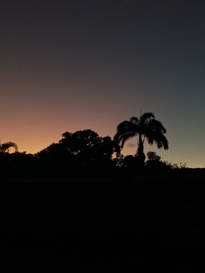 A silhouette of trees, including a prominent palm tree, stands against a multicolored sunset sky. The sky transitions from a deep blue at the top to orange near the horizon. The foreground is dark and undefined, contrasting with the illuminated sky and silhouetted trees. The scene evokes a tropical or coastal setting at dusk or dawn.