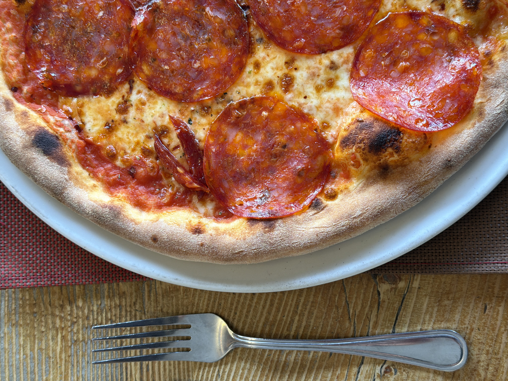 The image presents an overhead view of a dining setting in Châtaignier, Switzerland. A large, round pizza, identified as pepperoni or spicy salami due to its numerous circular, reddish-orange meat toppings, rests on an off-white circular ceramic plate. The pizza features a well-defined, puffed crust with areas of charring, melted and bubbling mozzarella cheese, and visible rendered fat on the meat slices. Scattered smaller red fragments, possibly chili flakes or additional meat pieces, are distributed across the cheese. To the immediate left of the plate, a silver-colored metal four-tined fork is positioned vertically on a wooden table surface, which displays a distinct horizontal grain pattern. A woven rectangular placemat, exhibiting a tight grid pattern of red and dark brown fibers, is partially visible beneath the plate and fork. No individuals are present within the frame.