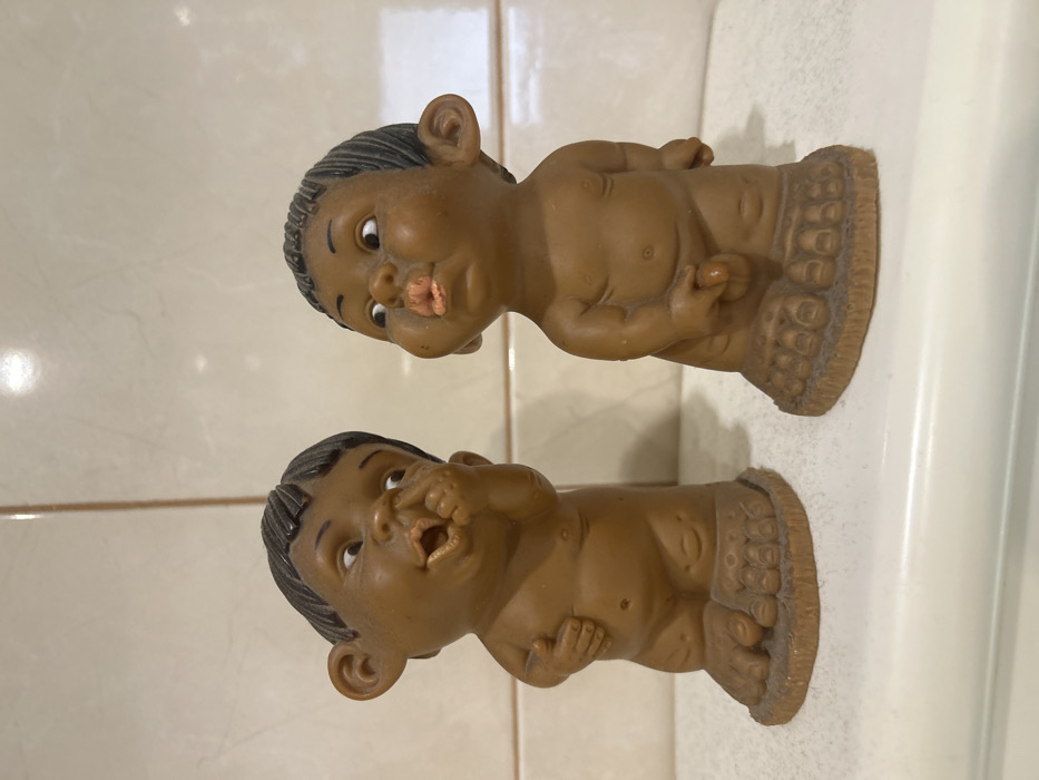 Two brown, figurines of babies with dark hair are positioned on a tiled surface and white sink. The upper figurine seems to be puckering his lips while the lower one is pointing inside his mouth. Both are depicted with hands gently placed on their chests and large, expressive eyes. Their bodies are not entirely complete, with a flat, textured base that resembles a foot or pedestal. The figures' skin has a glossy finish and they appear to be made of a plastic or resin-like material.