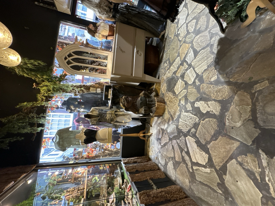 The image depicts the interior of a retail establishment located in Amsterdam, Netherlands. The floor is covered with irregularly shaped flagstones in various shades of grey and beige, set in dark grout. To the left, a multi-tiered glass display case exhibits numerous miniature fantasy-themed models, including intricate structures and figures, arranged on artificial green turf and naturalistic elements. The lower section of this display is clad in dark, textured material resembling tree bark. In the mid-ground, a light-toned mannequin bust on a wooden tripod displays a black, lace-up corset-style top. Adjacent to it, a dark mannequin wears a layered, silvery-grey dress with a distressed or tattered appearance and a high collar. A brown, crouching gargoyle-like statue holding a spherical object rests on a circular wooden log section to the right of the central mannequins. The background is a large storefront window displaying an urban street scene with building reflections. Within the window, several mannequins are visible, including one wearing a light-colored short-sleeved top and another dark mannequin adorned with internal lights and draped in dark fabric. Artificial trees with green and reddish foliage, some with trailing vines, are integrated into the window display and extend towards the ceiling. To the right, a light-colored, two-drawer dresser is topped by a white gothic-arched mirror frame. Partially visible mannequins further right display a brown and white peasant-style blouse and a dark, layered skirt. The dark ceiling is decorated with hanging artificial foliage and features several organic-shaped glass light fixtures.