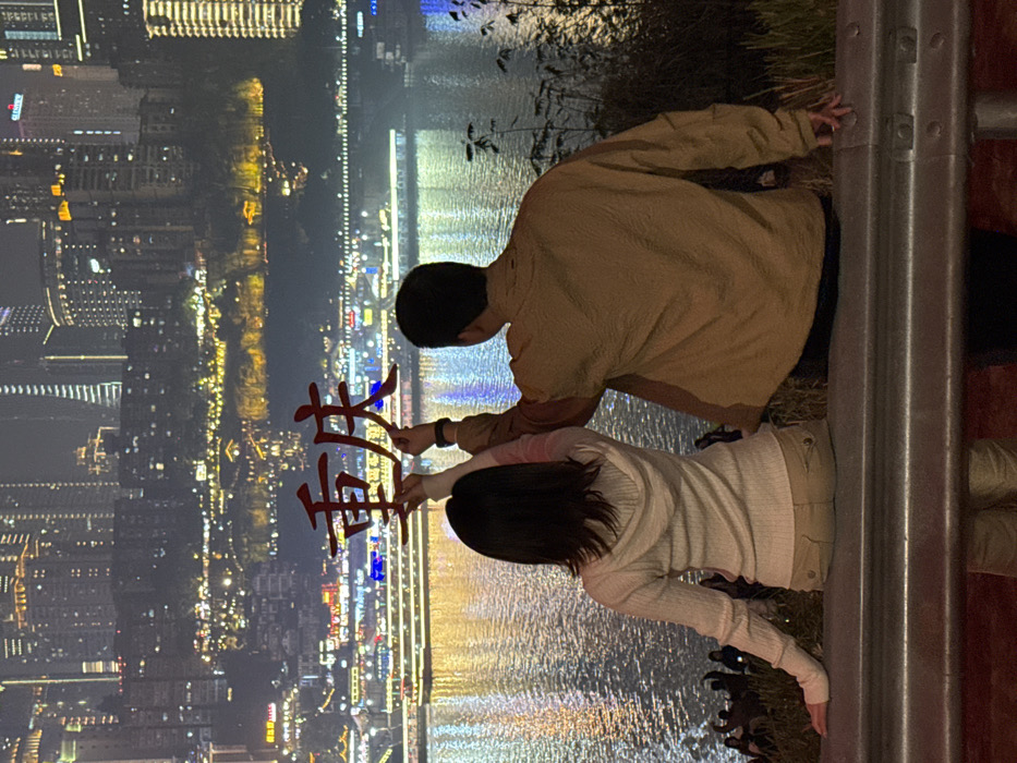 The image presents a nocturnal urban panorama in Chongqing, China, specifically viewed from an area within 江北城街道 (Jiangbeicheng Subdistrict). In the immediate foreground, two individuals, observed from behind, are seated or perched on a silver-colored metal barrier. The person on the left wears a light-colored ribbed hooded long-sleeved top and light-colored pants. The person on the right wears a tan or light brown long-sleeved jacket. Their raised arms collaboratively hold a red-colored sign displaying the two Chinese characters "重庆" (Chóngqìng) above their heads. The midground features a wide, dark river, likely either the Jialing or Yangtze River, reflecting numerous bright artificial lights from the city and several large, illuminated multi-deck vessels, including at least one cruise ship, navigating its surface. To the lower left, below the main subjects and on a lower bank, a cluster of indistinct figures is visible, many with arms raised, appearing to observe the river and cityscape. The background is dominated by a dense and brightly illuminated city skyline. Numerous high-rise buildings and skyscrapers, densely packed across hilly terrain, are visible against the dark sky, glowing with various yellow, white, and blue urban lights, characteristic of Chongqing's dramatic topography. Sparse dark foliage is present on the bank to the right of the barrier.