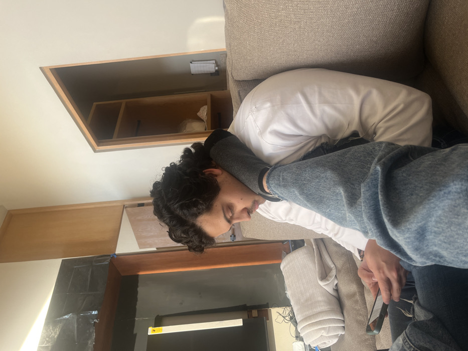 A man with curly dark hair rests on a couch. He wears a white top and is partially covered by a denim jacket. He appears to be holding a smartphone. A white pillow supports his head. In the background, there's a square opening in the ceiling with shelves visible inside. A wooden cabinet and what looks like a black tiled wall are also visible. The image is taken from a low angle, seemingly from someone sitting near the man on the couch.