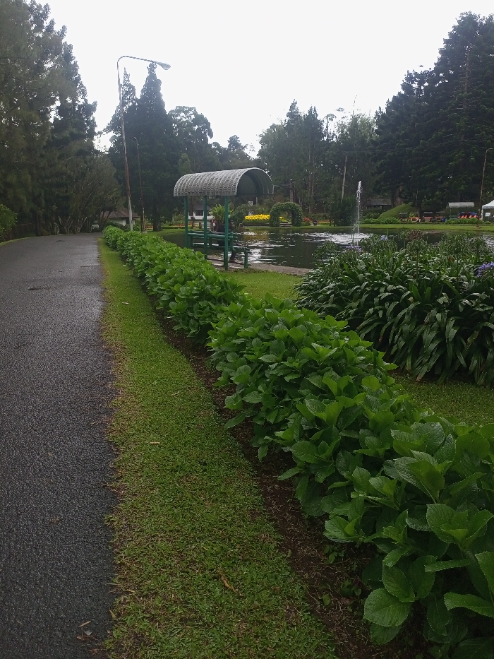 The image depicts a park-like outdoor scene under an overcast sky. In the foreground, a dark, wet asphalt path occupies the left side of the frame, bordered by a narrow strip of green grass. Adjacent to the grass, a continuous line of dense green broad-leafed bushes extends into the midground. To the right of the bushes, a body of water, likely a pond or lake, reflects the sky, with an active water fountain producing a vertical stream in its center. A green-painted shelter with an arched, corrugated metal roof is situated on the left bank of the water. A tall, grey street lamp post rises on the left side, extending above the treeline. The background features a dense collection of tall trees, including both coniferous and broadleaf species, suggesting a heavily vegetated area. Distant structures, possibly small buildings or ornamental arches adorned with flowers, are partially visible beyond the pond. No individuals are present, and no actions or interactions are depicted within the scene. The specific location within Beni, Nepal, is not discernible from the visual content of the image.