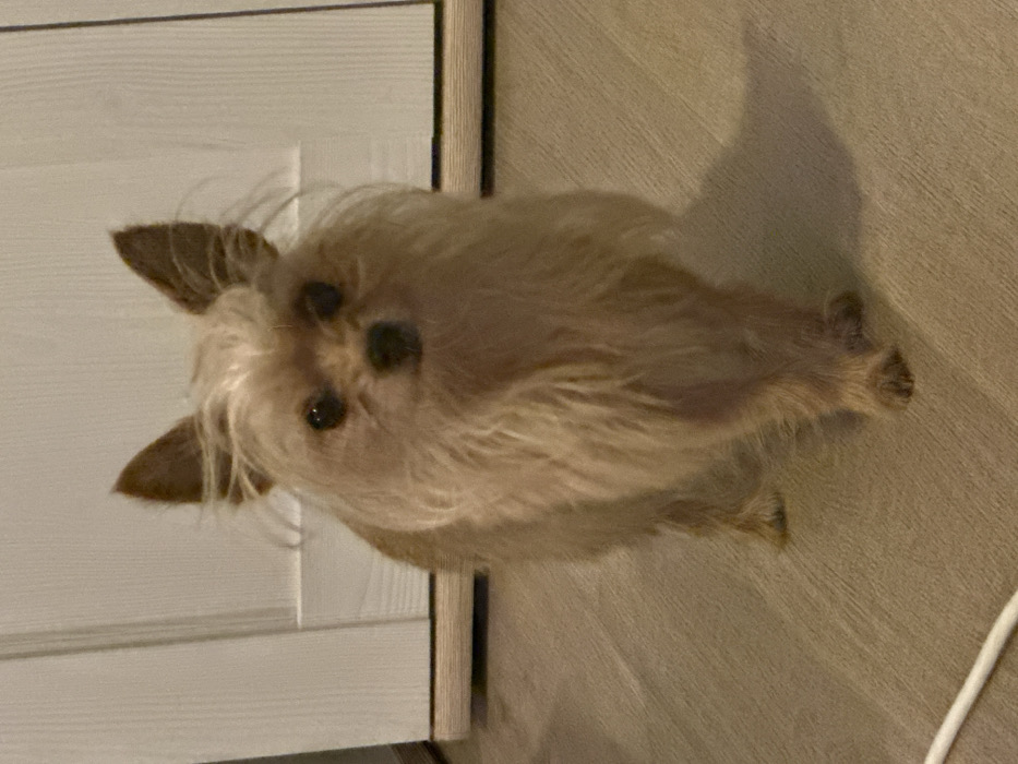 - "The image displays a small, long-haired dog, primarily light tan with lighter, almost white fur around its face and chest, standing on a light-colored laminate or wood floor" by FM-aVDG03, licensed under CC BY 4.0