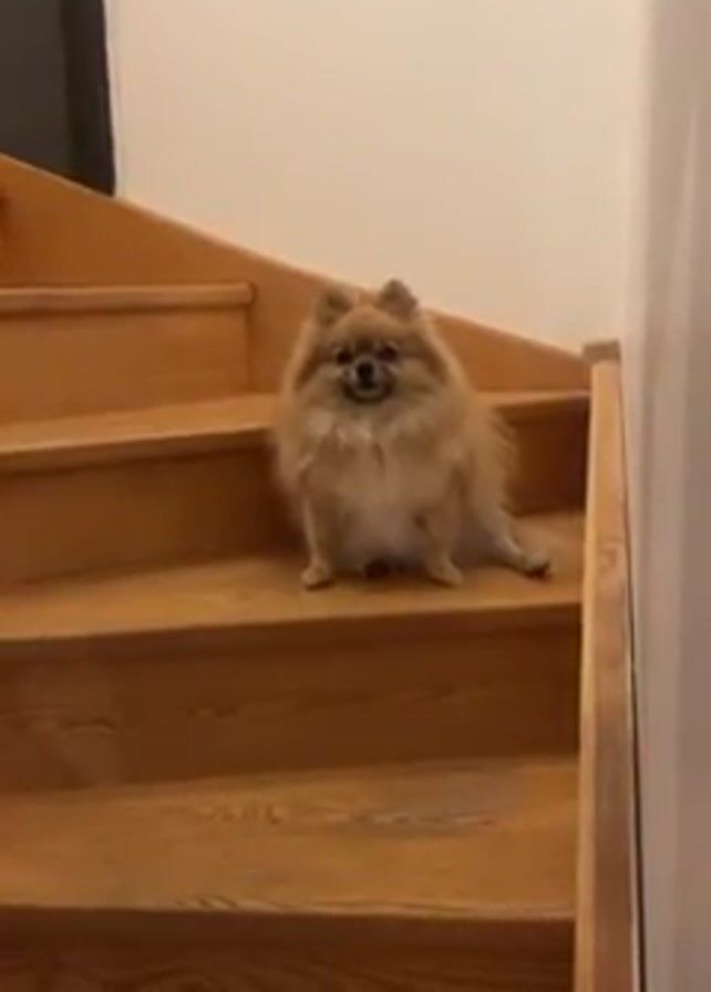 A small, tan-colored Pomeranian dog sits on the second step of a wooden staircase in an indoor setting. The dog is facing the camera with a slight smile or neutral expression. The staircase has a light wood finish, and the walls are painted white. A dark-colored object, possibly a framed picture or mirror, is visible on the wall to the left of the staircase. The overall lighting is soft and appears to be natural. In the background, a sound similar to a wind instrument is audible.