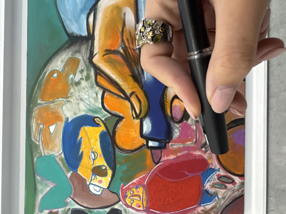 An indoor close-up depicts a human hand holding a dark pen or stylus against a framed artwork. The artwork, rendered in a cartoonish or graffiti-inspired style with bold colors and outlines, features stylized figures. A prominent yellow-faced figure with blue hair and beard, wearing a green garment, is visible in the upper left. Below it, a smaller figure in a red hooded sweatshirt appears. Large orange forms, possibly representing a hand holding a blue object, occupy the right and center of the artwork. The background consists of various colored shapes in green, teal, brown, and pink. The hand, likely female, wears a silver-toned ring with multiple clustered green and yellow gemstones on the ring finger. The pen is held with its tip pointing towards the lower-center section of the artwork. The scene occurs in an interior setting in Unknown, Unknown.