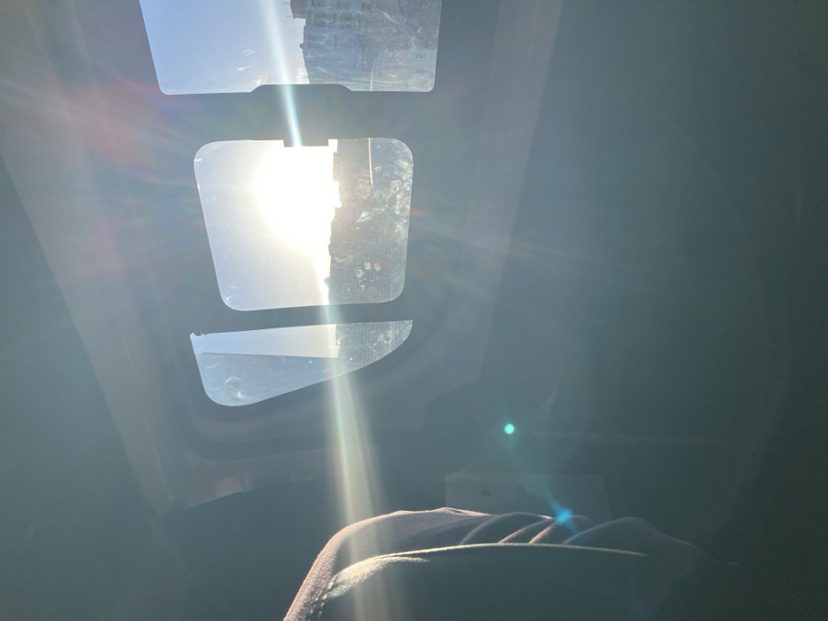 - "The image depicts the interior of a vehicle, likely a train, bus, or large van, with the sun low in the sky and directly visible through the windows, creating significant lens flare" by FM-MhJ4d2, licensed under CC BY 4.0