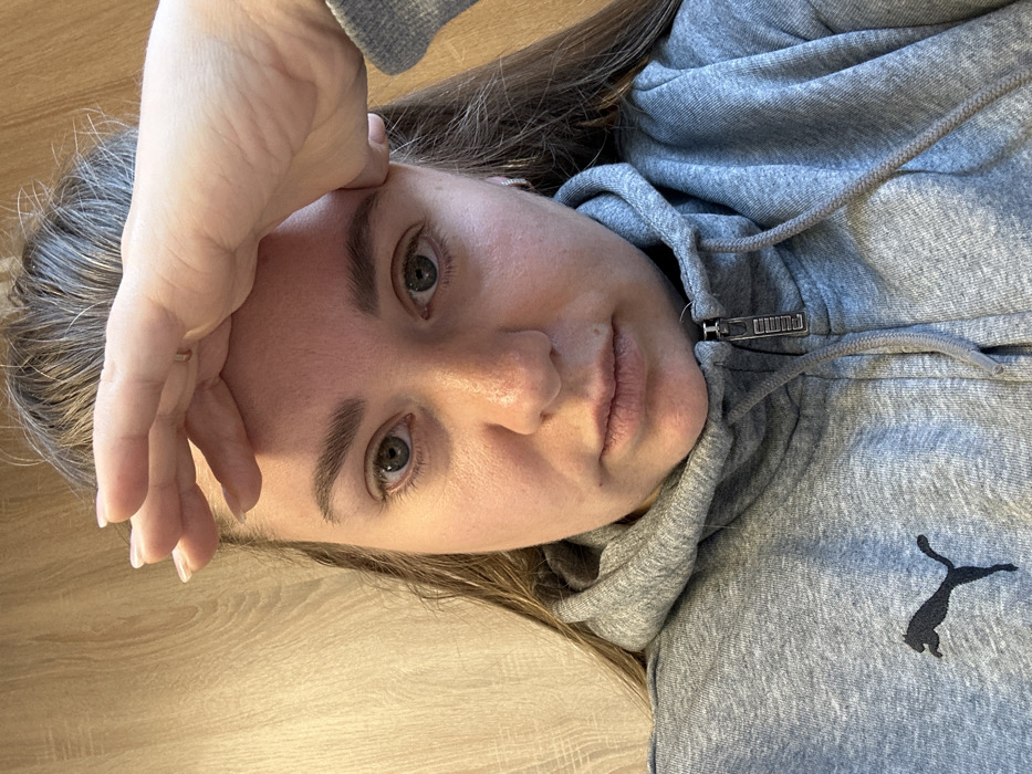A young adult female is depicted in a close-up, chest-up shot, looking directly forward. She has long, dark brown hair and blue-green eyes. Her right hand, with fingers splayed and neatly maintained nails, rests across her forehead. A simple band ring is visible on the fourth finger of her right hand. She is wearing a grey hooded zippered sweatshirt, which features a black Puma logo embroidered on the left chest and "PUMA" embossed on the zipper pull. The background behind her consists of a light brown wooden surface with a visible grain pattern. The scene is located in the city of Ural'skoe, Russia.
