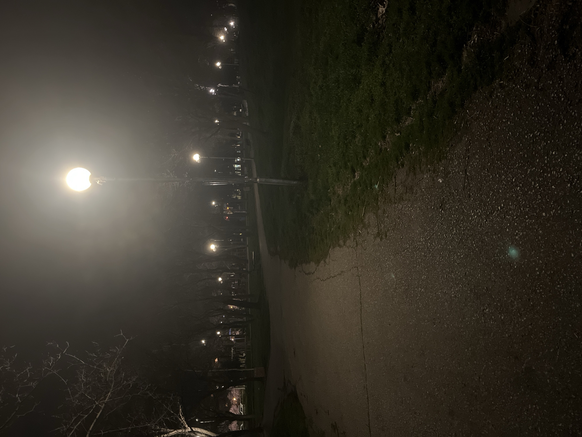 The image depicts a park pathway at night in Plovdiv, Bulgaria. The path is asphalt and is bordered on the right by grass. A row of streetlights illuminates the left side of the path. The lights are closely spaced and create a dense fog. Bare tree branches are visible against the background fog. Buildings are discernible in the background, illuminated by scattered lights.