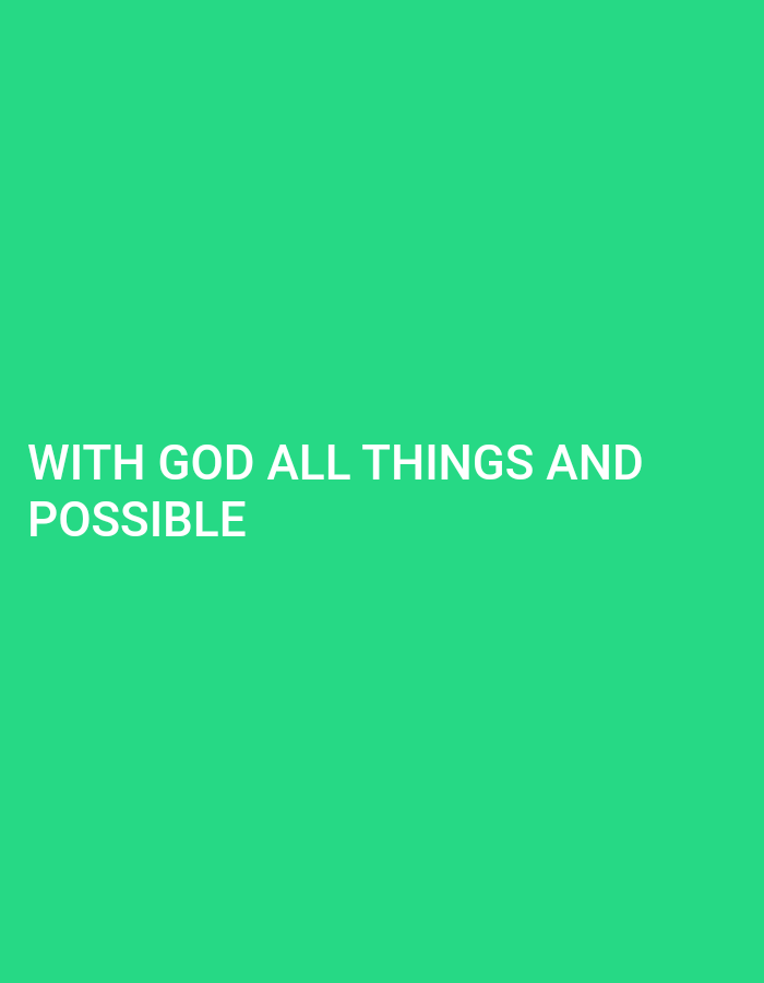 The image displays a solid, vibrant green background with white, sans-serif text aligned to the left in the lower portion. The text reads: "WITH GOD ALL THINGS AND" on the first line, followed by "POSSIBLE" on the second line. There are no people, objects, or environmental features visible beyond the colored background and text. The scene is static, devoid of actions or interactions. The location is Unknown, Unknown.