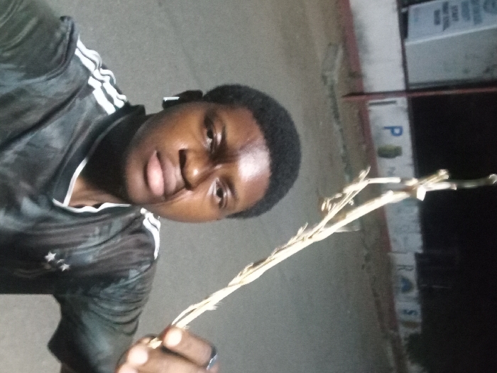 A young Black man is holding a dried plant stalk. He is wearing a black shirt with white stripes on the shoulders and a white logo on the front. The photo appears to be taken outdoors at night, with a street or road visible in the background. A sign or structure with the letters "PRS" is partially visible behind him. He is looking at the camera. The overall lighting is dim.