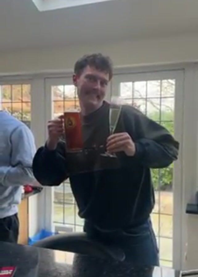 A young man in a sweater and jeans stands in a kitchen holding a mug of dark beer in one hand and a champagne flute in the other